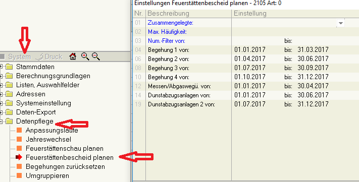Sie können z.B. die einmaligen Gebäude bearbeiten, wenn Max. Häufigkeit "1" aktiviert wird. Bei den zweimaligen Gebäuden muss Max. Häufigkeit "2" aktiviert werden. Bitte beachten Sie, wenn Sie die Planung über den ganzen Bezirk laufen lassen, dass sich dann alle Termine verschieben und mit den eingedruckten Terminen im Feuerstättenbescheid evtl. nicht mehr überein stimmen.