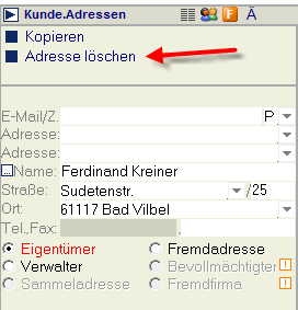 Hinweis:Ändert sich z.B. die Eigentümeradresse muss die alte Adresse über die Schaltfläche Adresse löschen gelöscht werden, erst dann kann die neue Adresse erfasst werden.
