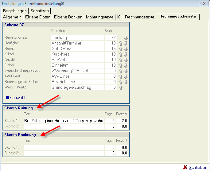 Hier können Sie Skonto für die Quittungen und Rechnungen vorbelegen.